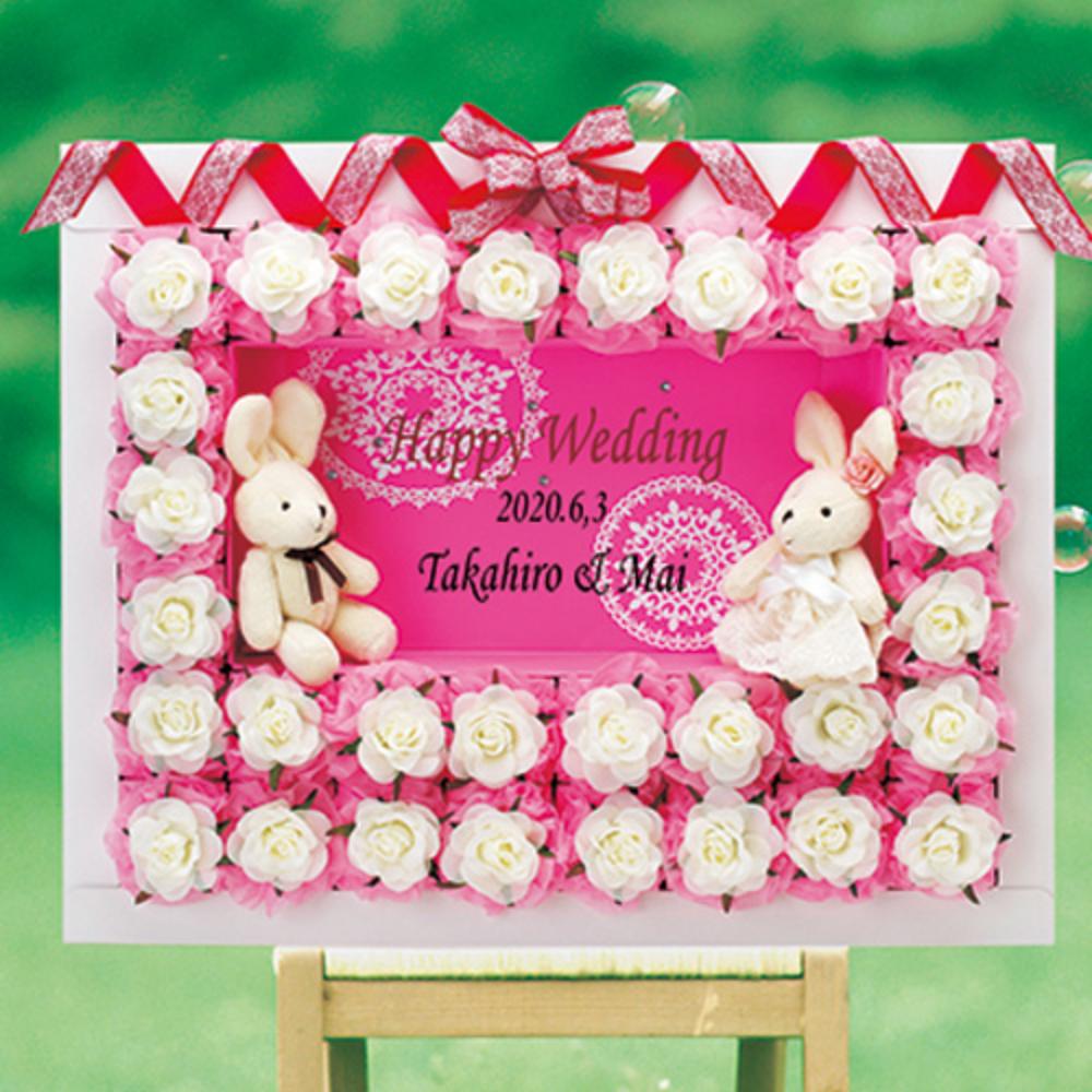 お花畑のように華やかに咲いた白い花がピンクのボードに映える、キュートなウェルカムボードです。