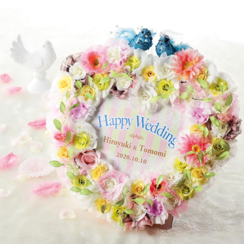 様々な種類のかわいらしいお花をアレンジしたウェルカムボードです。