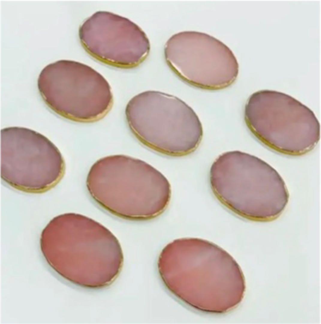 海外から取り寄せた天然石のローズクォーツに金縁を施してあります。
