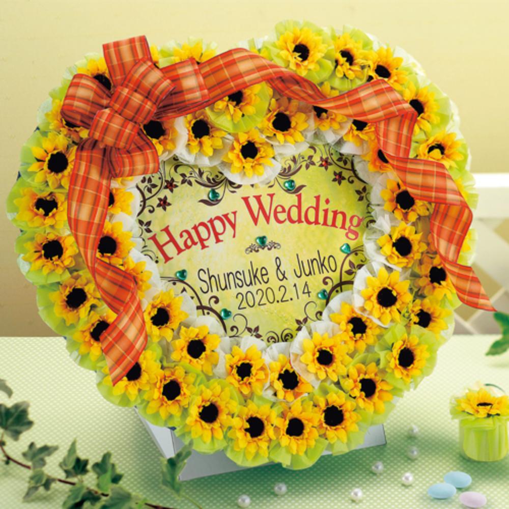 外側を二重のひまわりでデコレーションした、ハート型のウェルカムボードです。