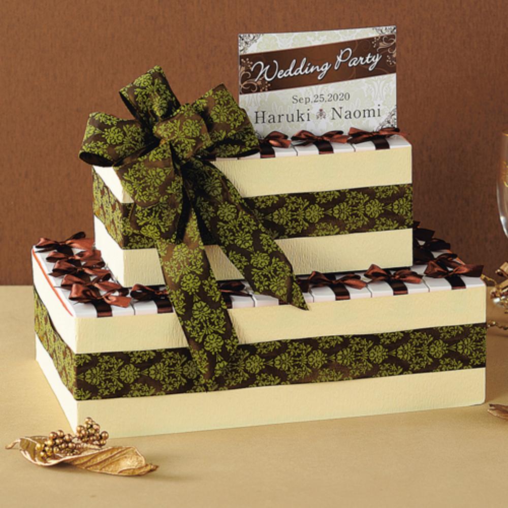 大きなリボンがあしらわれていますが、落ち着いた雰囲気は大人なお二人におすすめです 白いボックスにブラウンのサテンリボンの落ち着いた雰囲気で、中にホワイトストロベリーチョコが入ってます。