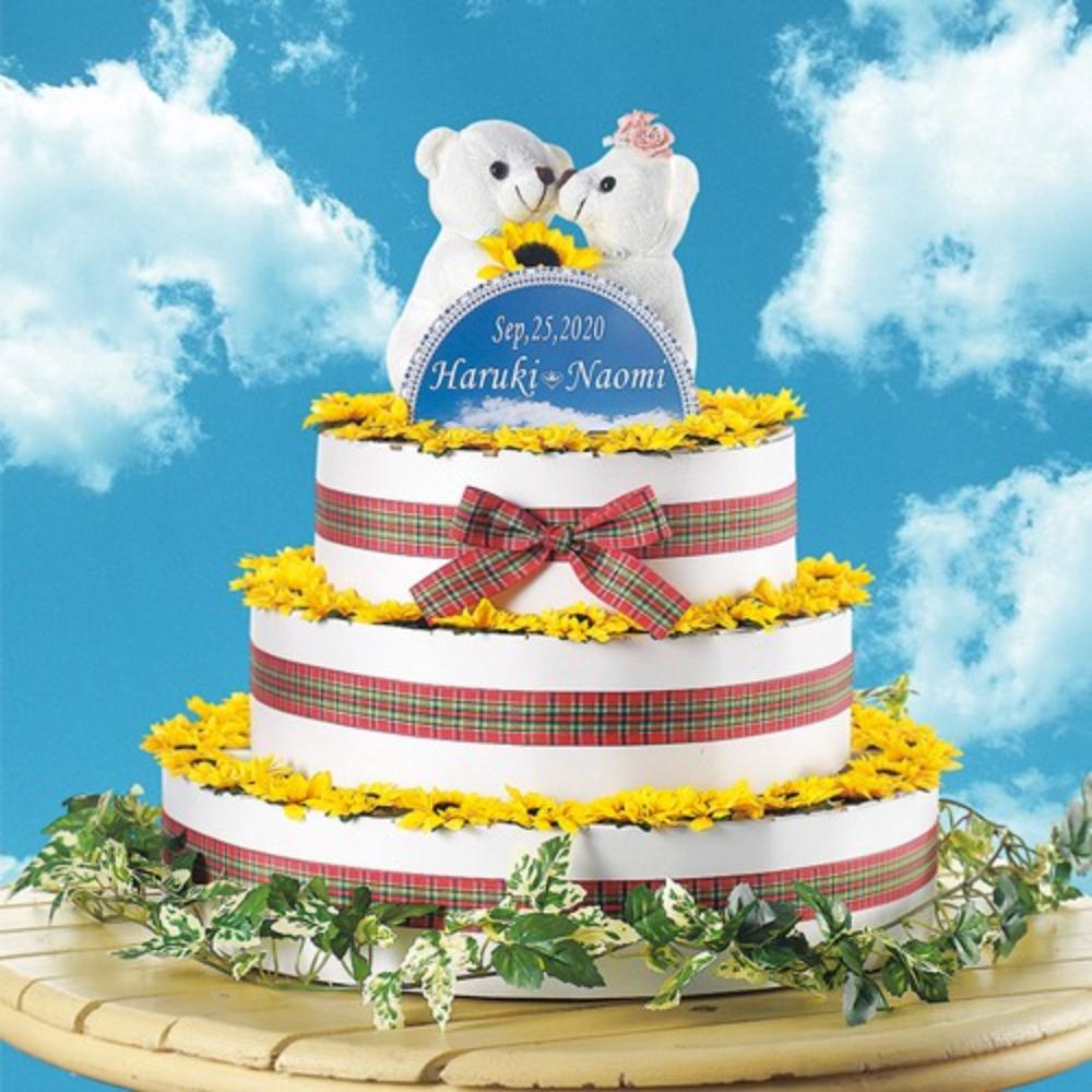 元気色のひまわりとチェックのリボンをあしらったケーキの上に飾られた、ウェディングベアがかわいいウェルカムボードです。
